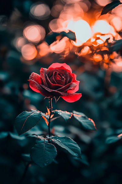 A radiant red rose surrounded by soft greenery, enveloped in the warm light of the setting sun, invites you to dream. Its glowing petals draw the eye and add a romantic touch to any room. Perfect for the living room, where it creates an atmosphere of calm and inspiration.