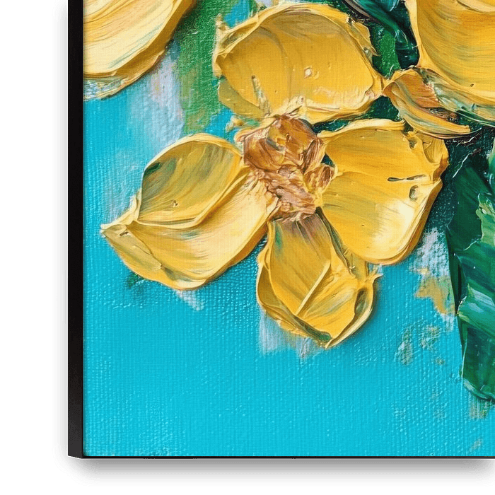 The painting shows bright yellow flowers radiating vividly against a soft blue background. The bold brushstrokes lend the flowers a dynamic texture, while the lush green tones of the leaves radiate harmony and freshness. An enchanting sight that awakens spring fever and captures the beauty of nature.