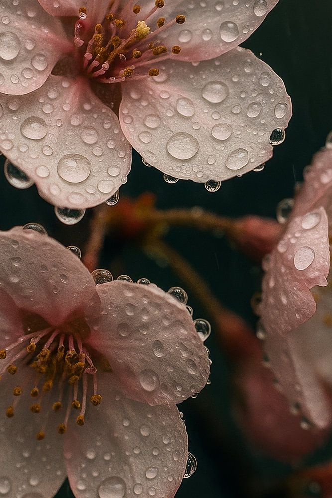 Tender cherry blossoms enveloped in raindrops, captured in a moment of stillness and beauty. Together, the soft petals and shimmering pearls of water form an intimate tribute to nature.