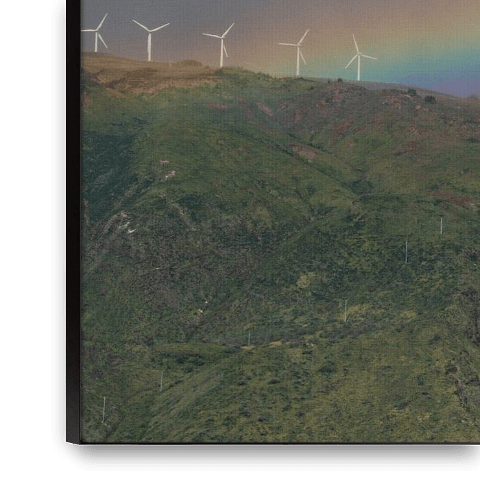Dramatic dark clouds gather over a long row of windmills at the top of a mountain ridge while a rainbow is visible on Maui in Hawaii.