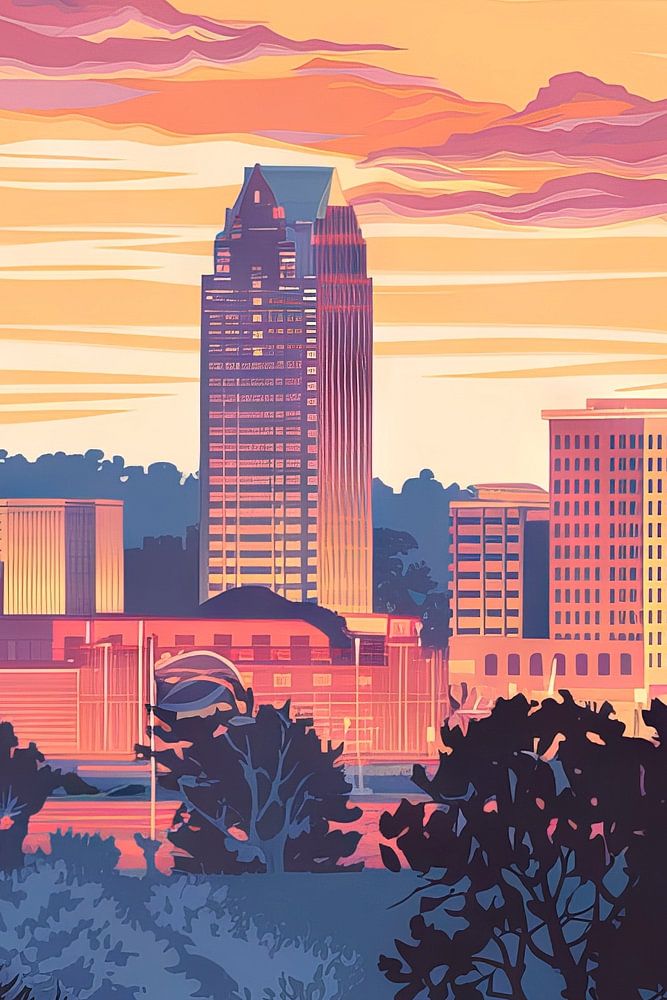 A colourful city portrait of Raleigh unfolds under a breathtaking sunset. The harmonious pastel colours of the clouds combine with the striking silhouettes of the skyline. This artwork adds a modern touch to any room and is particularly suitable for the living room, where it serves as an eye-catcher and conversation starter.