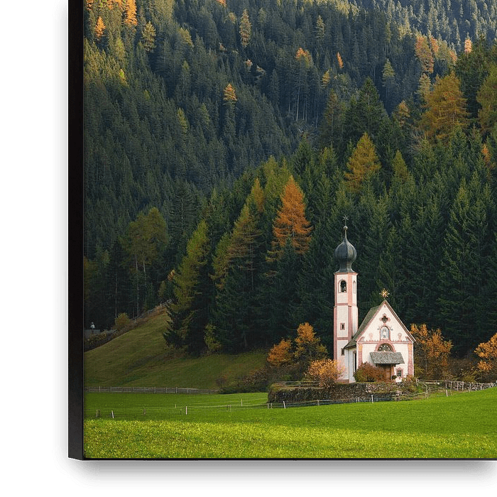 Buy this landscape artwork Ranui church with Dolomites mountains in autumn by iPics Photography on canvas, ArtFrame, poster and wallpaper, printed on demand in high quality.