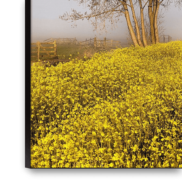 What wonderful conditions to photograph, ground fog in combination with a breaking sun and on top of that the nice contrasting colour of the yellow rapeseed with the blue sky.