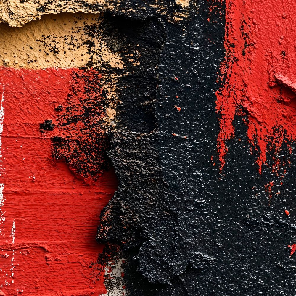 An abstract painting with thick impasto-like brushstrokes consisting of dominant colours. The overall impression is one of raw energy created by the thick layer of paint and the strong colour contrasts.