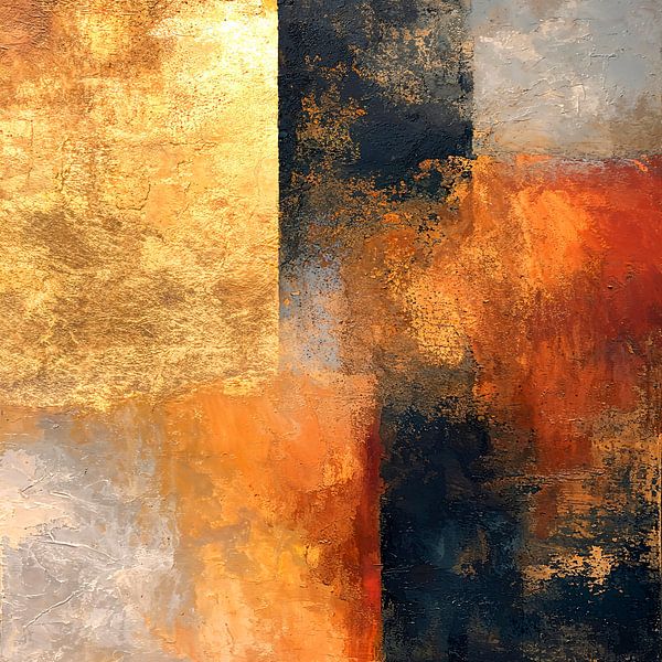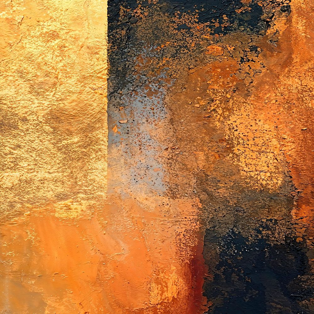 An abstract painting with a textured composition dominated by a rich, shimmering gold with a textured metallic finish, creating a vibrant surface; the overall style is expressive and abstract.