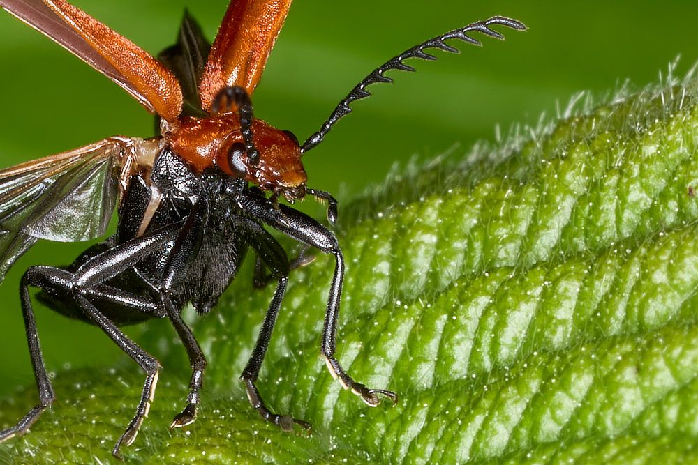 While on holiday in Dutch Zealand, I took this photo of the red-headed fire beetle (Pyrochroa serraticornis). After taking several close-up photos'of this beautiful creature, I patiently waited for it to fly. My wait was rewarded with this beautiful photo.