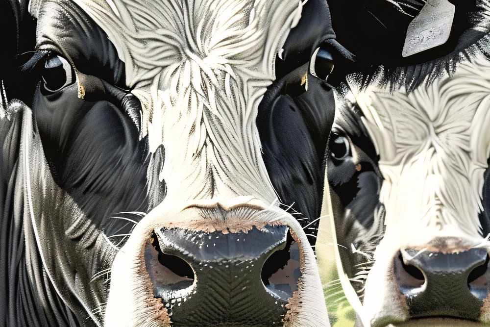 This fascinating design brings the viewer close to the essence of the countryside with a detailed depiction of two curious cows. The contrast between the black and white pattern of the cows and the subtle background colours creates a powerful visual effect. This image exudes calm and simplicity, ideal for an office space where concentration and relaxation come together. The subtle nuances in the rendering of the cows emphasise the quality of the design, making it a perfect decor piece for animal and nature lovers. Add a touch of country life to your interior with this unique display.