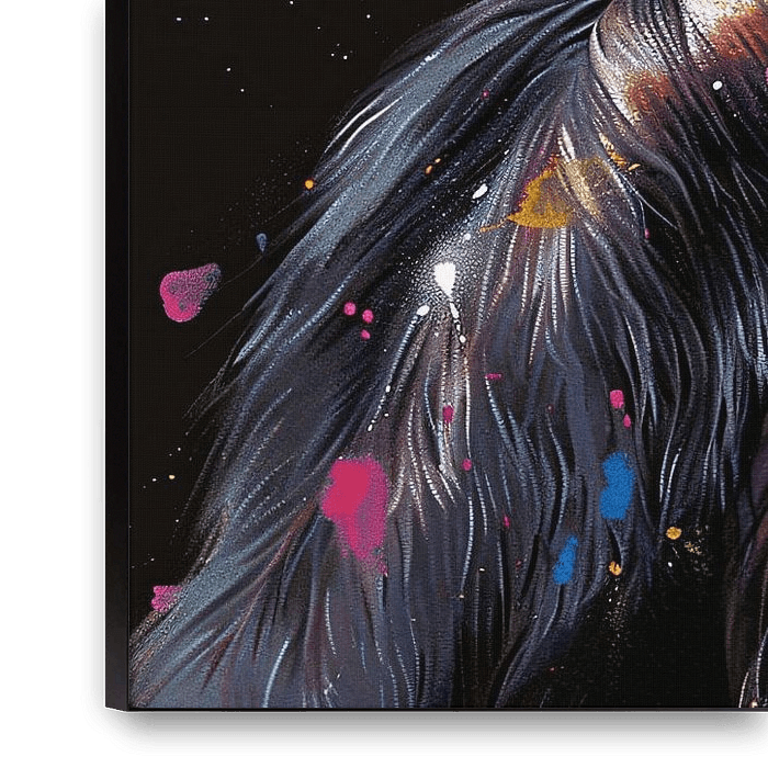 This beautiful painting combines realism with a dynamic explosion of colours. It shows a realistically depicted monkey with detailed facial expressions, framed by colourful splashes of paint that give a sense of energy and movement. This artwork would be a striking addition to any space, whether in a living room, office or other…