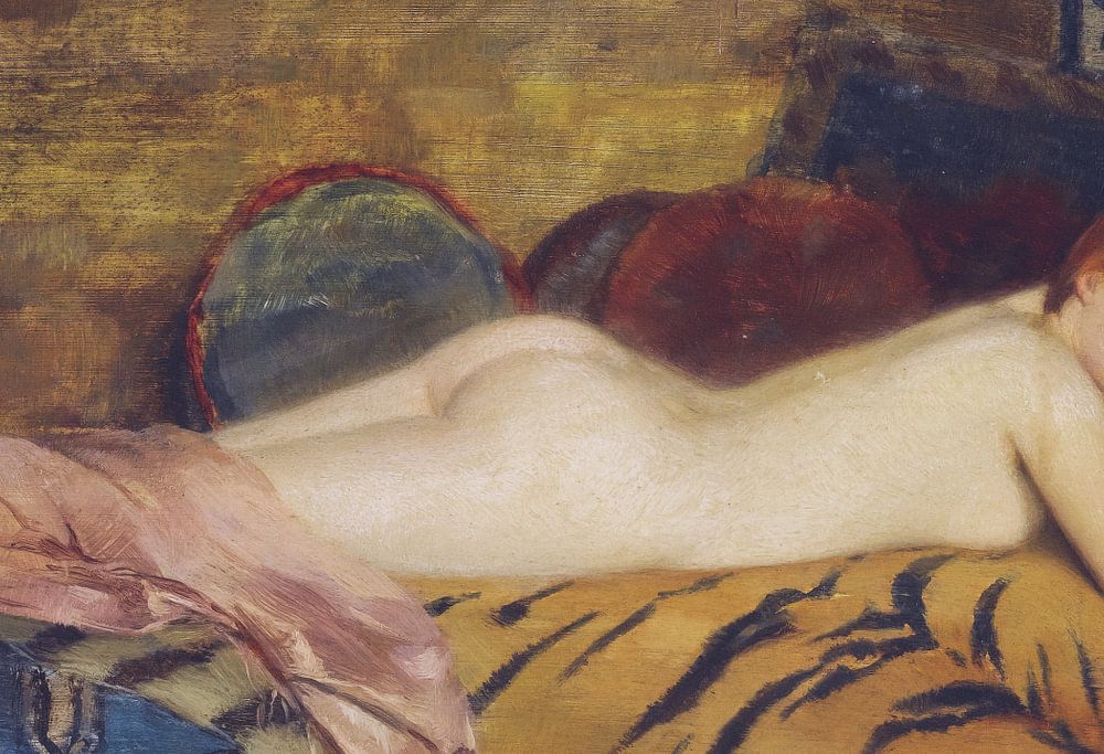 This nude model is lying on her belly on a tiger skin. The girl is exposed, but has her lower legs covered, but but buttocks, back and shoulders bare. The woman lies on a pillow and looks dreamily at the artist with her lips sensually apart.
