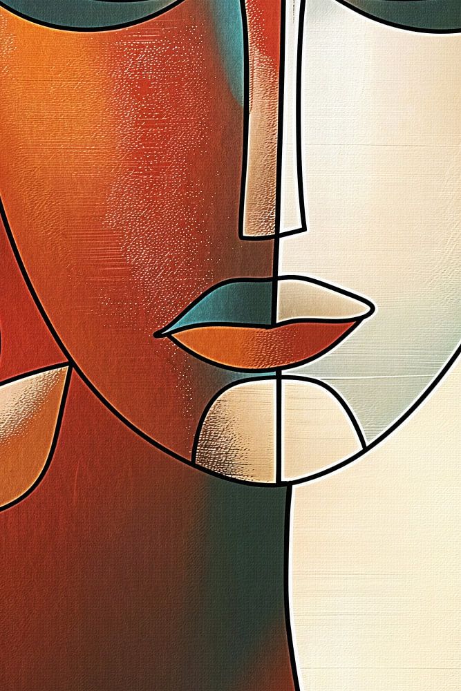 Figurative abstraction in earth tones with the portrait of a woman,flower petals and line drawing elements.