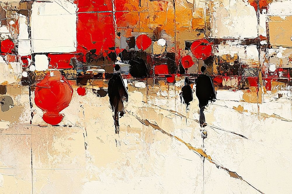 Red Abstract City - This abstract painting features a dynamic city scene with figures, where red and beige tones enrich the composition and abstract shapes and lines suggest an impression of movement.