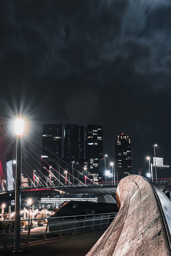 Red Erasmusbridge at night Rotterdam by vedar cvetanovic