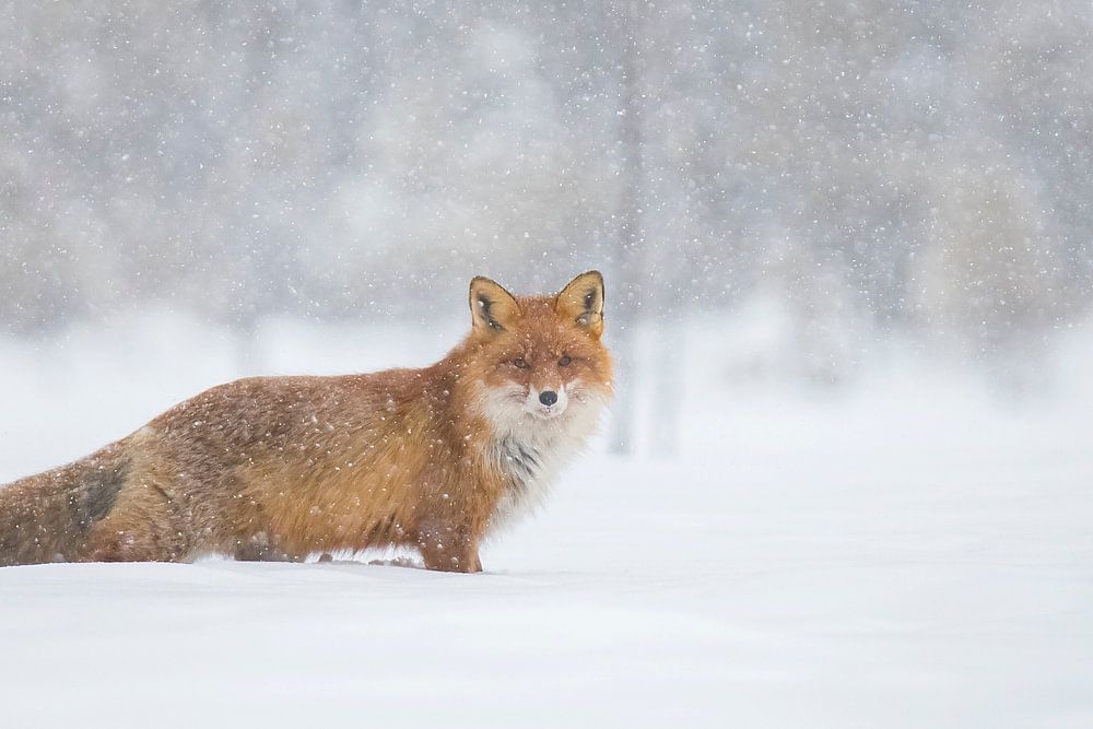Vulpes vulpes, fox in a snowstorm. North Sweden