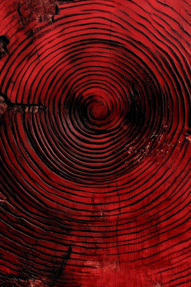 This powerful artwork highlights the natural concentric lines of wood grains, framed by an intense red background. The black details and textures enhance the contrast, creating a hypnotic and dynamic effect with the grains. The weathered accents add a raw, earthy aesthetic that symbolises the timelessness of natural materials. Perfect for modern interiors with a bold, rustic or industrial look.