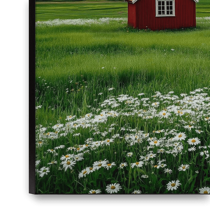 In the midst of endless, lush green meadows, a bright red cottage rises up, its windows almost looking like eyes in the midst of the wildflowers. The dramatic sky, streaked with dark clouds, creates an exciting contrast and lends the scenery a mysterious atmosphere - the calm before the storm?