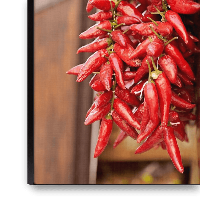 Deze rode pepers vind je overal in Calabrië. Mooi geknoopt wachtend op verkoop.