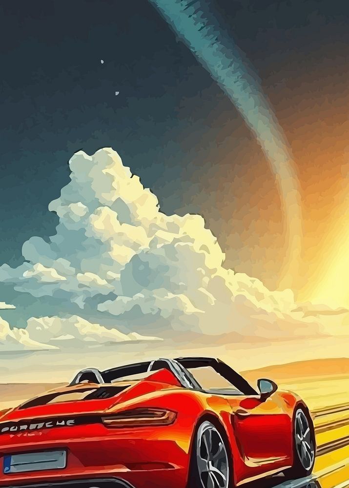 The red 718 Spyder dances across a bright sunlit road, clouds parting to reveal both daylight and distant stars in a surreal fusion of time. The bright red curves shine like molten metal, while the sun and stars blend in harmony overhead. It’s speed wrapped in warmth, chasing the horizon between daylight and dream.