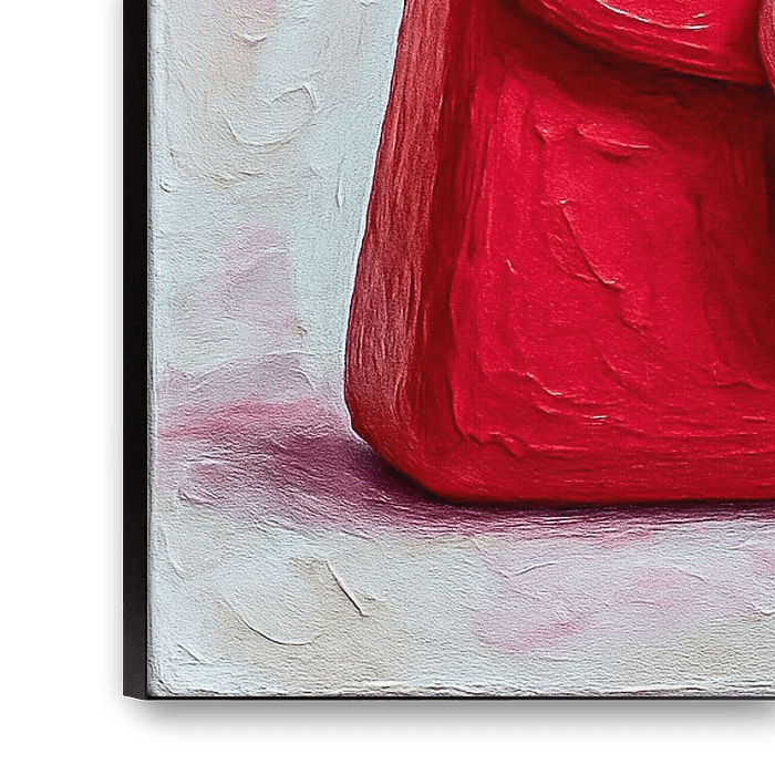 This red bag exudes warmth and softness. The playful pink heart on the front gives the design a sweet and cheerful look, making it perfect for colourful interiors. The soft brush strokes and creamy texture make this artwork vibrant yet soothing.