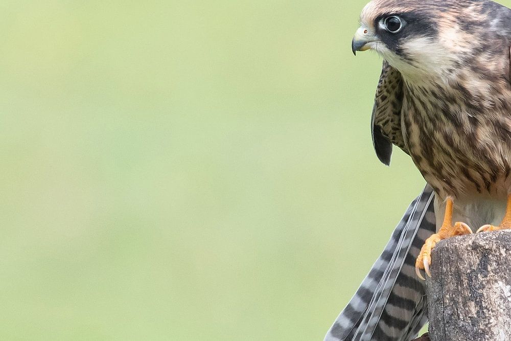 This red-legged falcon was sitting nicely on this post with barbed wire, The lovely green soft background shows it off beautifully.