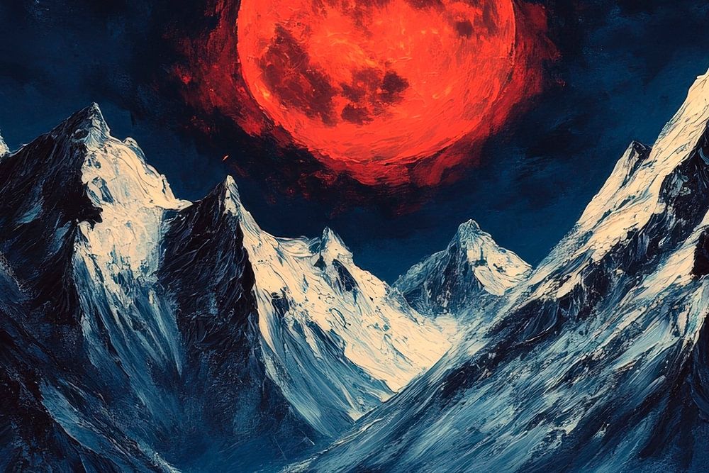 A moonlit mountain landscape unfolds in deep, mystical colours. The stunning blood-red disc of the moon casts a mysterious light on the rugged peaks and gently flowing river. This image exudes a dramatic and captivating atmosphere, perfect for a living room to spark conversation and inspiration.