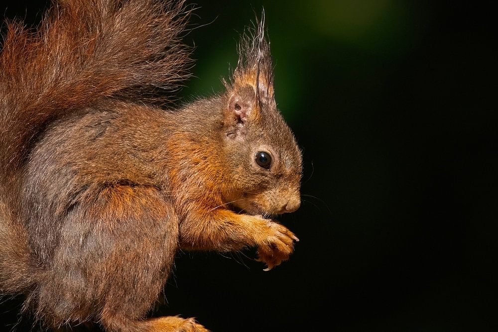 Our European red squirrel beautifully posing and nibbling on a nut. One of our most beautiful animals.