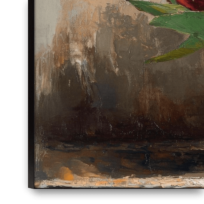 Vibrant, red tulips unfurl from a charming, antique-looking pot and bring a touch of spring to the scene. Their vibrant red colour contrasts wonderfully with the soft, earthy background, while the glossy surface of the pot further enhances the beauty of the flowers. A play of colour and shape that immediately catches the eye.