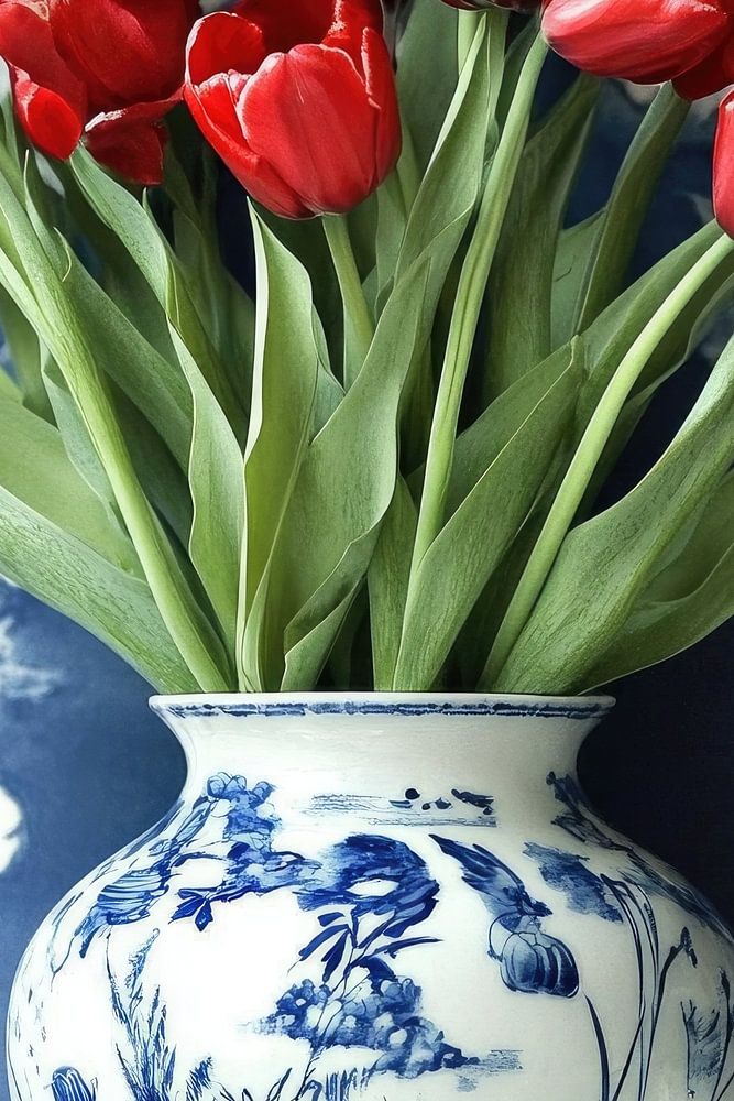 This elegant artwork captures the essence of Dutch symbolism in a powerful composition: fiery red tulips in a traditional Delft blue vase. The vibrant flowers stand out expressively against the calm, picturesque background in shades of blue with floral patterns. The contrast between the bright shades of red and the classic blue and white creates a timeless look with a modern twist. A refined and powerful image that exudes tranquillity as well as energy - perfect for any interior with a love of art and heritage.
