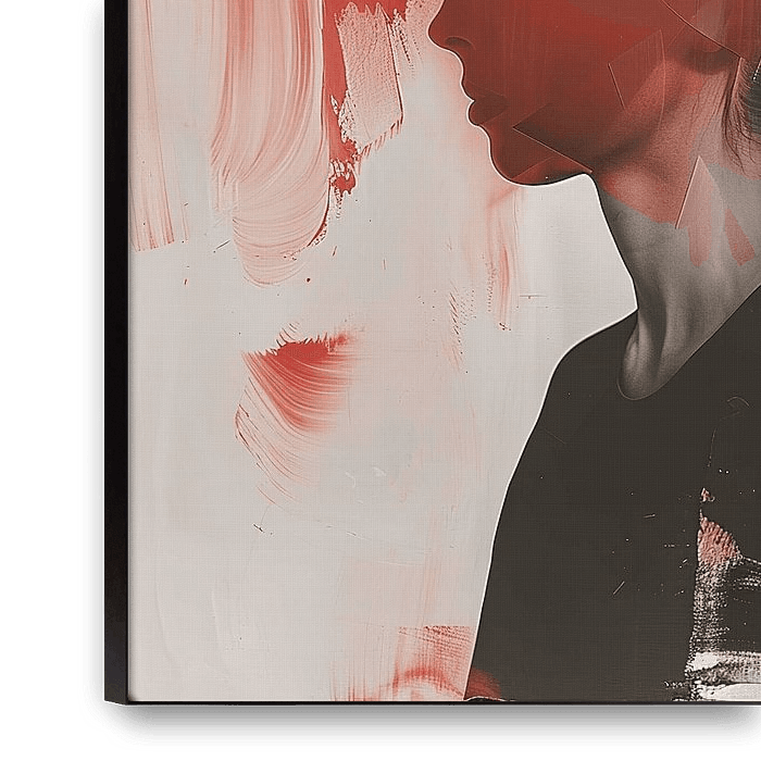 A mystical, surreal female portrait in which an opulent, red blossom is enthroned on the woman's head. The blossom is vibrant and powerful in deep red tones, giving it an almost regal aura that emphasises the woman's enigmatic beauty. The abstract background in soft, blurred colours forms a dreamy contrast to the intense, luminous…