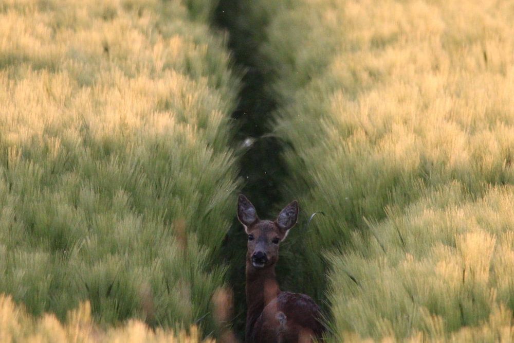 A roe deer is hiding in the wheat field. The wheat creates a kind of blurred background around the roe deer. This makes the roe deer stand out extra in the photo.