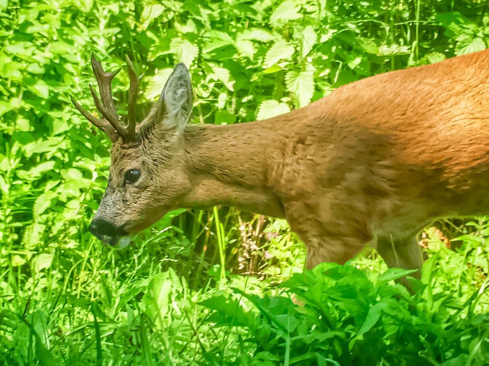 A young roe deer grazes on a sunny morning, in the background all the greenery is illuminated by the sun.