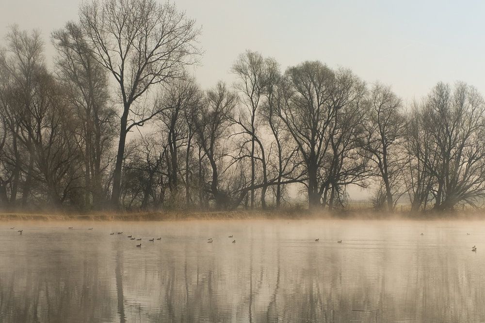 A row of bare and half-leaved trees form a serene, almost dreamy morning scene along a quiet pond. The slight ripples on the water create gentle distortions in the reflections