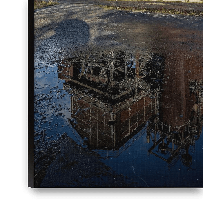 Old factory installations in the landscape park Duisburg (Germany) with a reflection in a puddle of water.