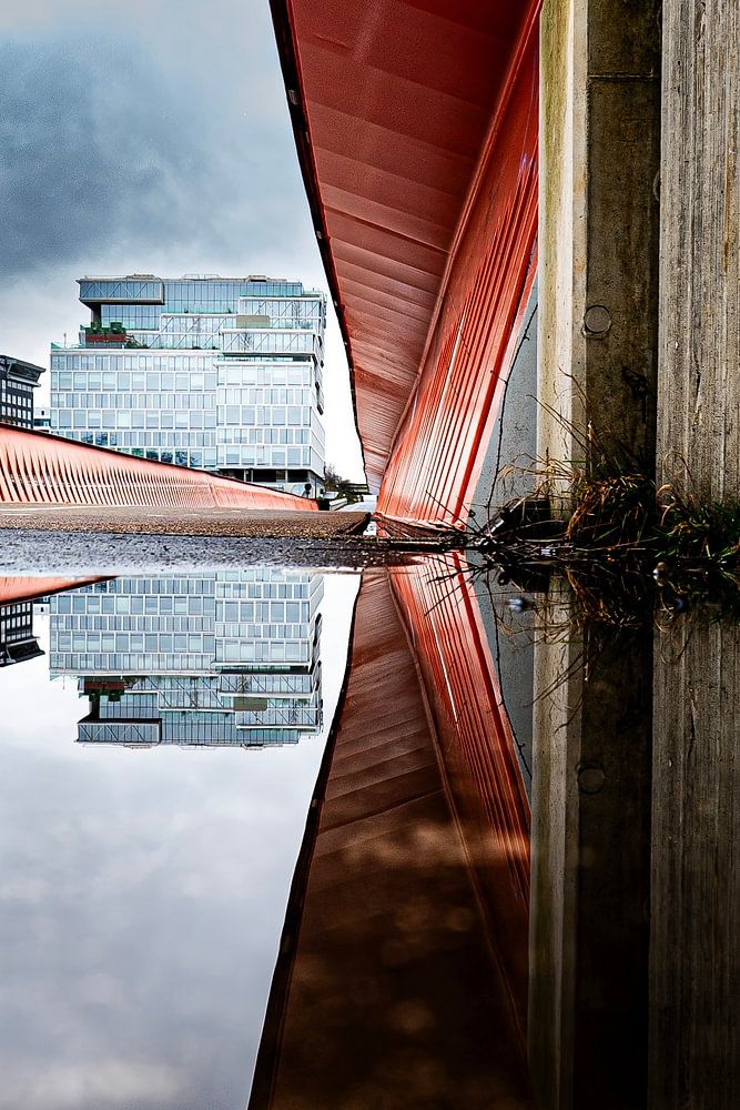 This is a nice photo with a reflection of a red bridge.