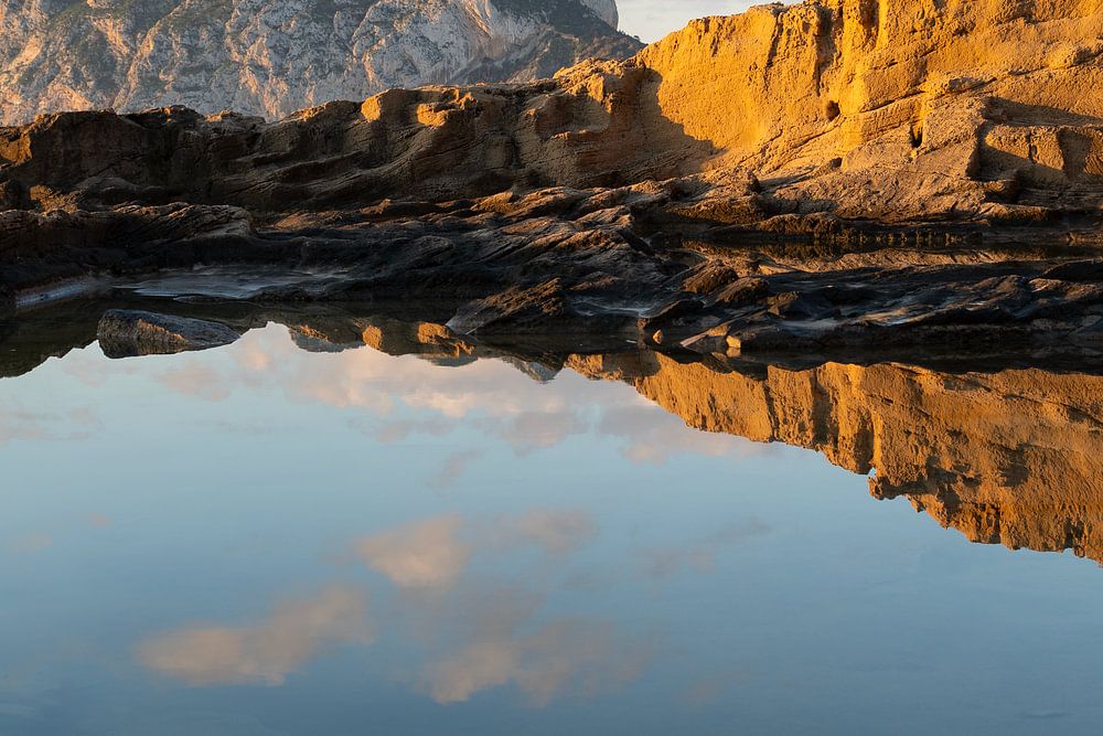 At sunrise on the Mediterranean coast in Calpe, the cliffs are bathed in golden light. The soft blue tones of the sky are reflected in the clear water. In the distance, the Peñón de Ifach Natural Park rises up from the sea and seems to merge with the rock formation in the foreground. Soft clouds float in the sky, emphasising the…