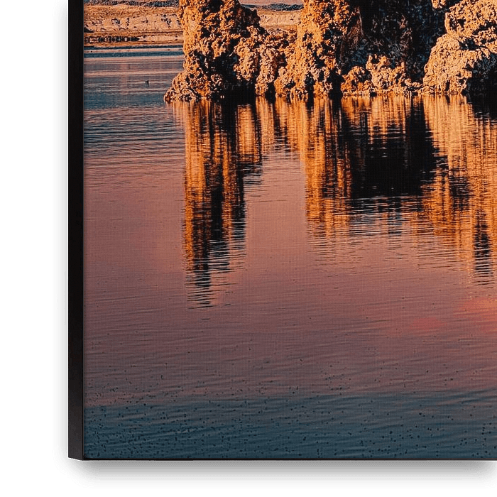Reflection of tuff rocks in Mono Lake in the Sierra Nevada in California with clouds at sunset