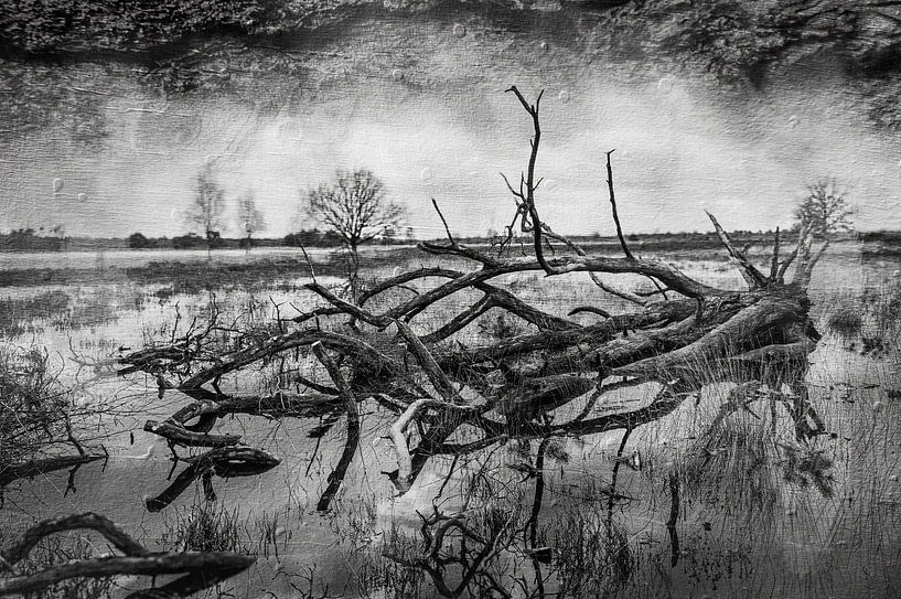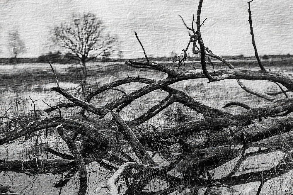 This black-and-white photograph depicts a tranquil floodplain where water and land merge. In the foreground lies a fallen tree, its gnarled branches stretching out like a sculpture above the mirror-like water.