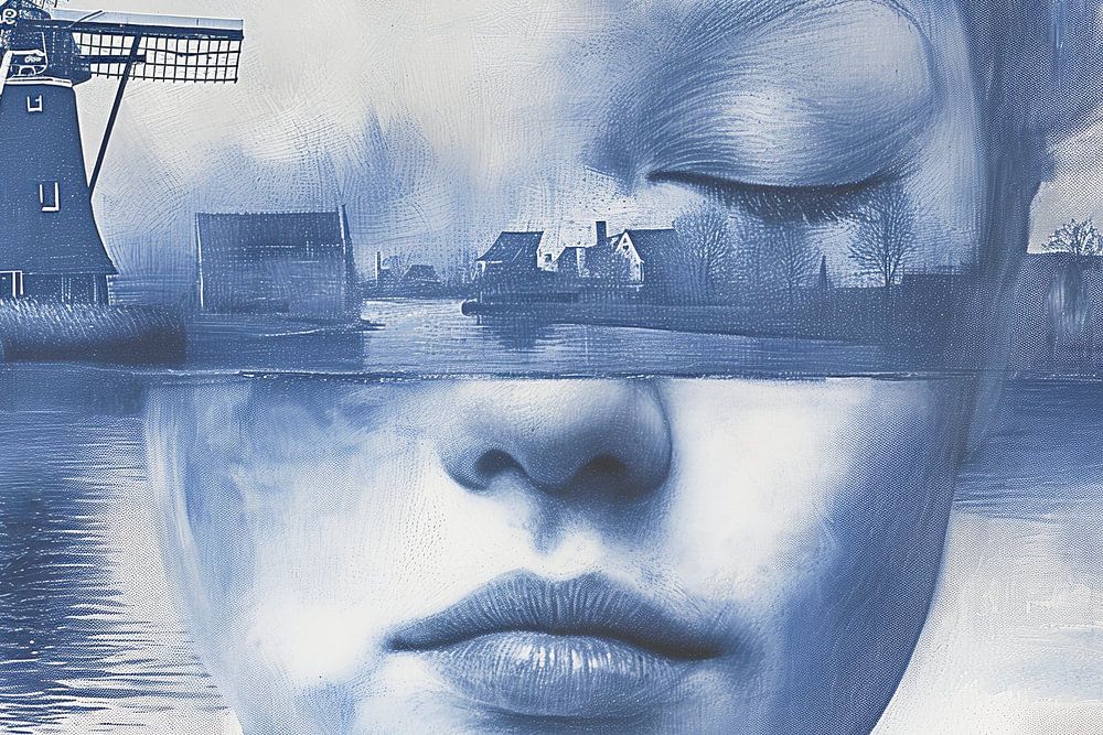 A portrait of a woman and a typical Dutch landscape including a windmill.