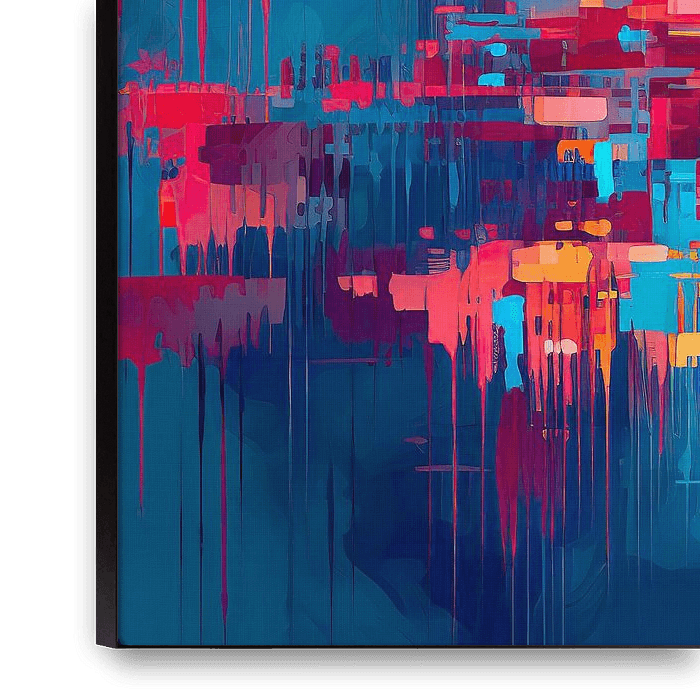 This abstract artwork offers a vibrant dynamic composition with sharp angles and straight lines that provide a sense of stability and balance.