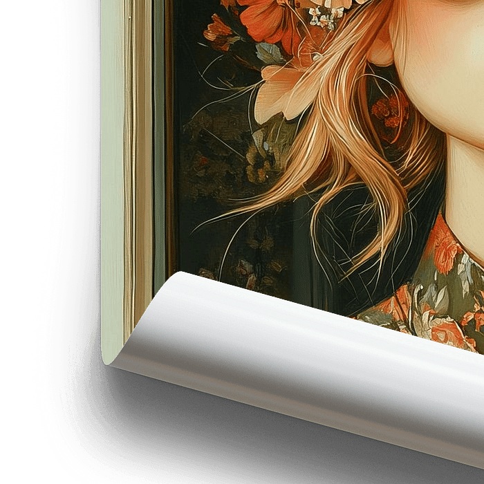 Reflective Glasses Flower Woman - This women's painting shows a young woman with a wreath of vibrant flowers in her hair and large sunglasses showing a reflection of a landscape.