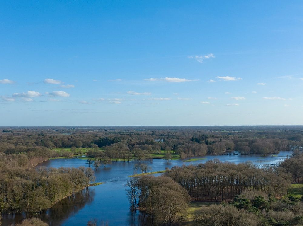 High water level in the river Regge in the Dutch Vechtdal region in Overijssel, The Netherlands. The river is overflowing on the floodplains after heavy rainfal upstream in The Netherlands and Germany during storm Eunice and Franklin in February 2022.