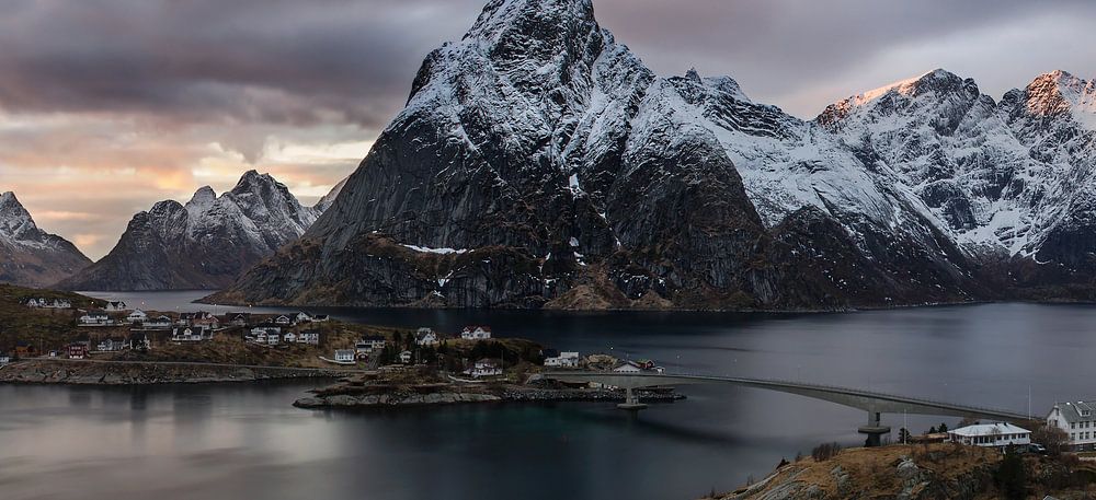 Sakrisoya Island on Reinefjorden among snowy mountains at sunset, Lofoten