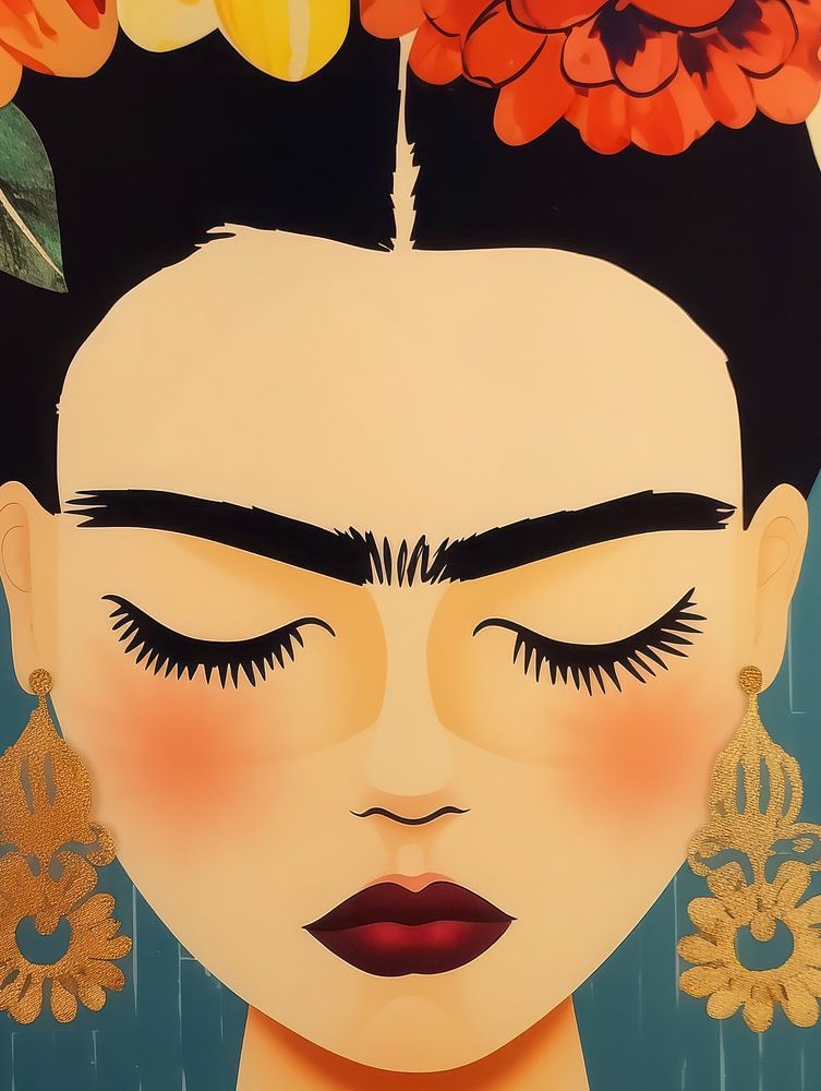 There are countless Frida portraits, self-portraits and works by other artists that show their affinity with the charismatic artist. Her unique paintings and her commitment to women's rights and feminism in an art world dominated by men make her a contemporary icon. Here she is shown in a very relaxed manner, with the typical floral decoration in her hair. The picture comes in a modern, trendy bohemian style and fits on any wall with its understated retro colours.