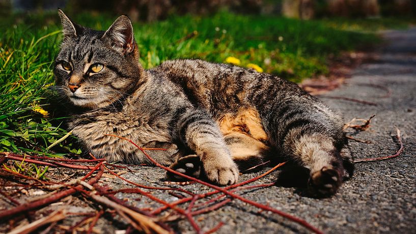 Immerse yourself in the calming world of animal love with this enchanting print of a relaxed cat. The picture shows a tabby cat resting on a path in the sun. Its dense fur in various shades of brown and black stripes as well as its warm, yellow eyes give the motif a special depth and vibrancy. Surrounded by green grass and scattered…