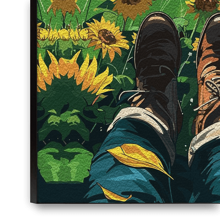 Immerse yourself in this breathtaking scene of a traveler relaxing in a vast sunflower field beneath towering mountains. This artwork captures the perfect harmony of adventure, peace, and nature's beauty, ideal for decor and gifts.