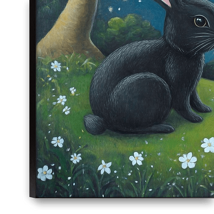 Two rabbits, one black and one white, sit on a lawn under a crescent moon and a starry sky. Trees frame the scene and enhance the enchanting atmosphere.