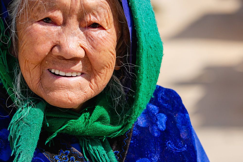 Old woman in beautiful colorful traditional clothing. Kunming, Yunnan, China