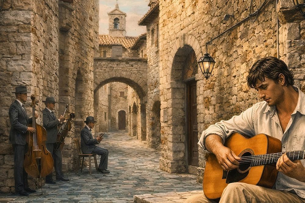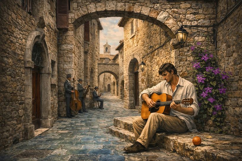 This painting transports you to a sun-drenched corner of Italy, where time seems to slow to the rhythm of a guitar. The composition is beautifully framed by a sturdy stone arch that lends depth and a sense of security to the scene. The warm sunlight caresses the rough walls, bringing every stone and every detail of the paving to life.…