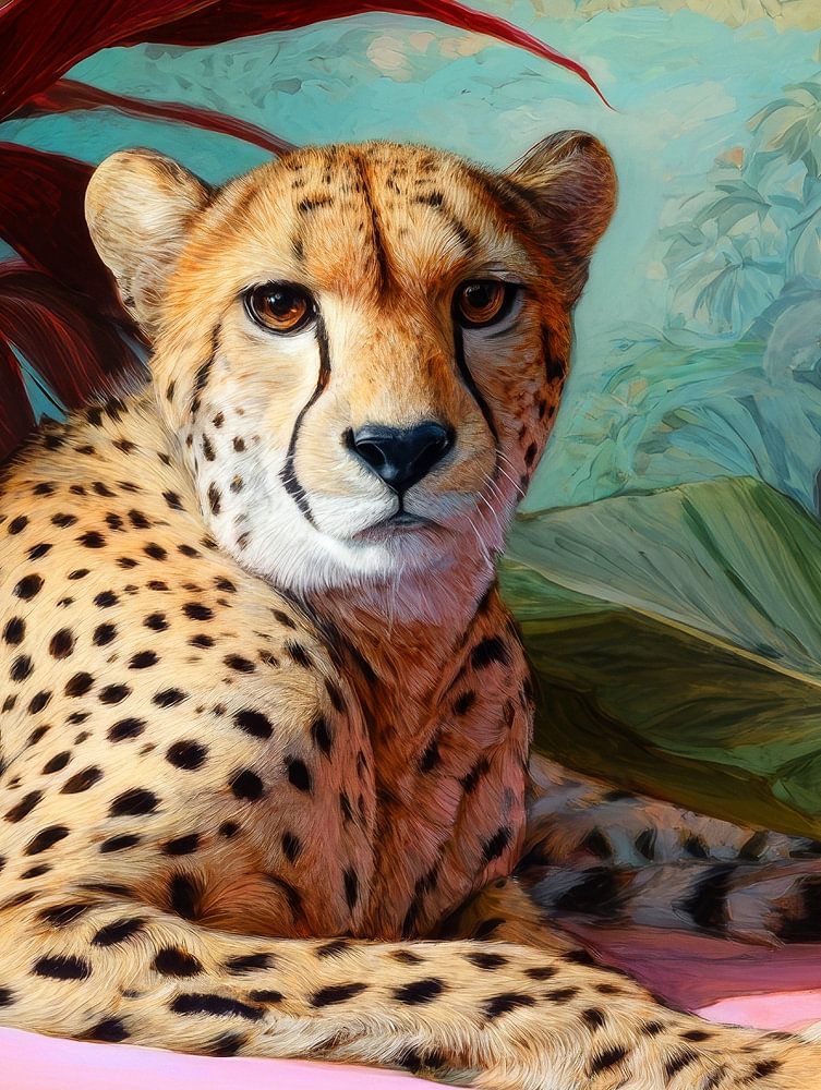 In this colourful artwork, a cheetah lies relaxed on a soft pink surface, surrounded by lush tropical plants. The animal exudes both strength and calm, with its sharp gaze falling straight into the viewer's eyes. The bright red leaves contrast beautifully with the soft shades of pink and green, giving the scene an almost surreal intensity. The combination of the cheetah's graceful pose and the exotic surroundings gives the work a dreamy, luxurious feel. It feels like a meeting between wild nature and sophisticated art, a moment of stillness in which time seems to stand still. It is an image that is at once powerful and graceful, full of energy but also tranquillity. An ode to the beauty of nature and the majesty of this special animal.