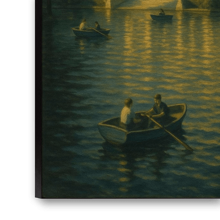 This artwork celebrates Madrid’s union of nature and architecture. The composition feels cinematic—where structure meets soul, and light becomes language. Each boat seems suspended in stillness, evoking calm conversations and quiet thought. The painterly handling of reflection blurs the line between sky and water, inviting the viewer into a meditative calm.