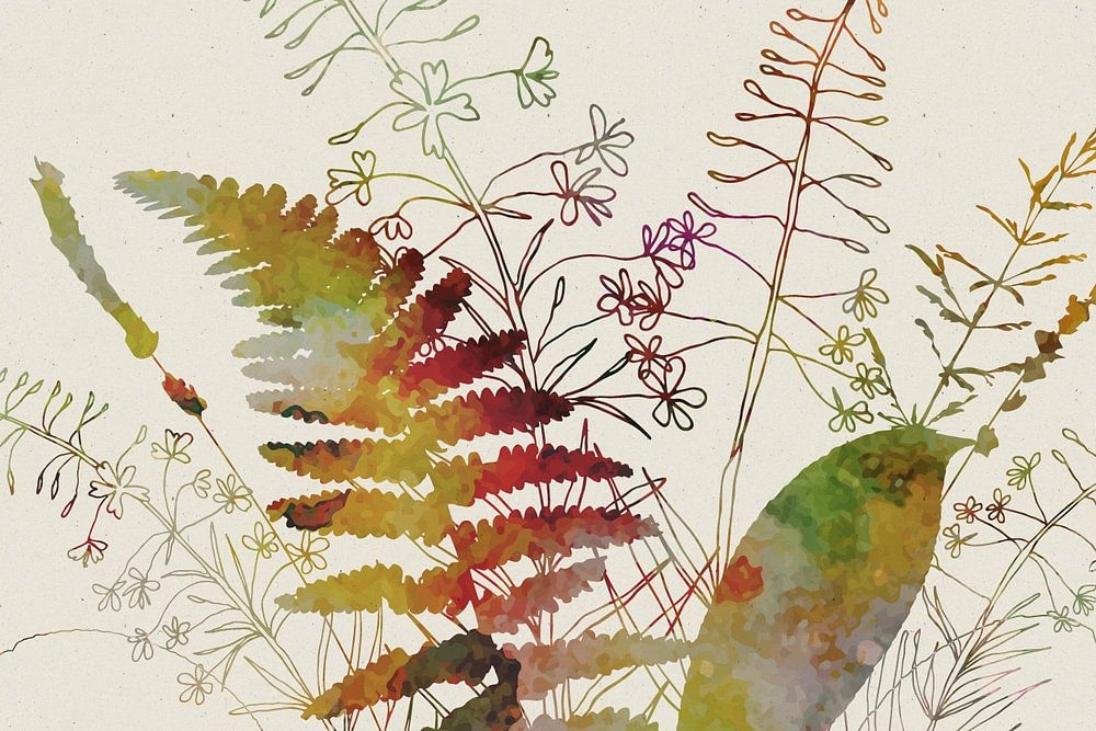 This botanical illustration features a delicately composed bouquet of fern leaves, fireweed, and lavender. Created in a soft, retro-inspired pastel palette, it captures the calming beauty of wild flora with a touch of vintage charm. The composition feels both natural and refined, bringing a sense of lightness and quiet detail to any interior.